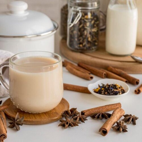 Embrace the "Spiced Velvet Chai" – a cup of indulgence that's as nourishing as it is delightful. Envision cinnamon's comforting warmth, cardamom's captivating essence, and saffron's golden allure mingling in a symphony of spices. Clove, ginger, star anise, and black pepper add layers of depth, creating a harmonious blend that soothes and rejuvenates. As the spices steep in hot milk, they transform into a rich, velvety elixir that wraps you in a luxurious embrace. Each sip is a journey into a world of flavors that dance elegantly on your palate. The "Spiced Velvet Chai" is an exquisite treat, a fusion of taste and well-being that envelops you in comfort, leaving you both satisfied and enchanted by the intricate melody of spices and milk.